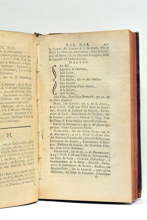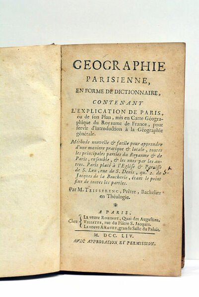 Géographie Parisienne, en forme de Dictionnaire, contenant l'Explication de Paris, ou de son Plan, mis en Carte Géographique du Royaume de France, pour servir d'Introduction à la Géographie Générale. Méthode nouvelle et facile pour apprendre d'une manière pratique et locale, toutes les principales parties du Royaume et de Paris, ensemble et les unes par les autres. Paris placé à l'église et paroisse de S. Leu, rue de S. Denis, qu. 2 de Jacques de la Boucherie, étant le point fixe de toutes les parties.