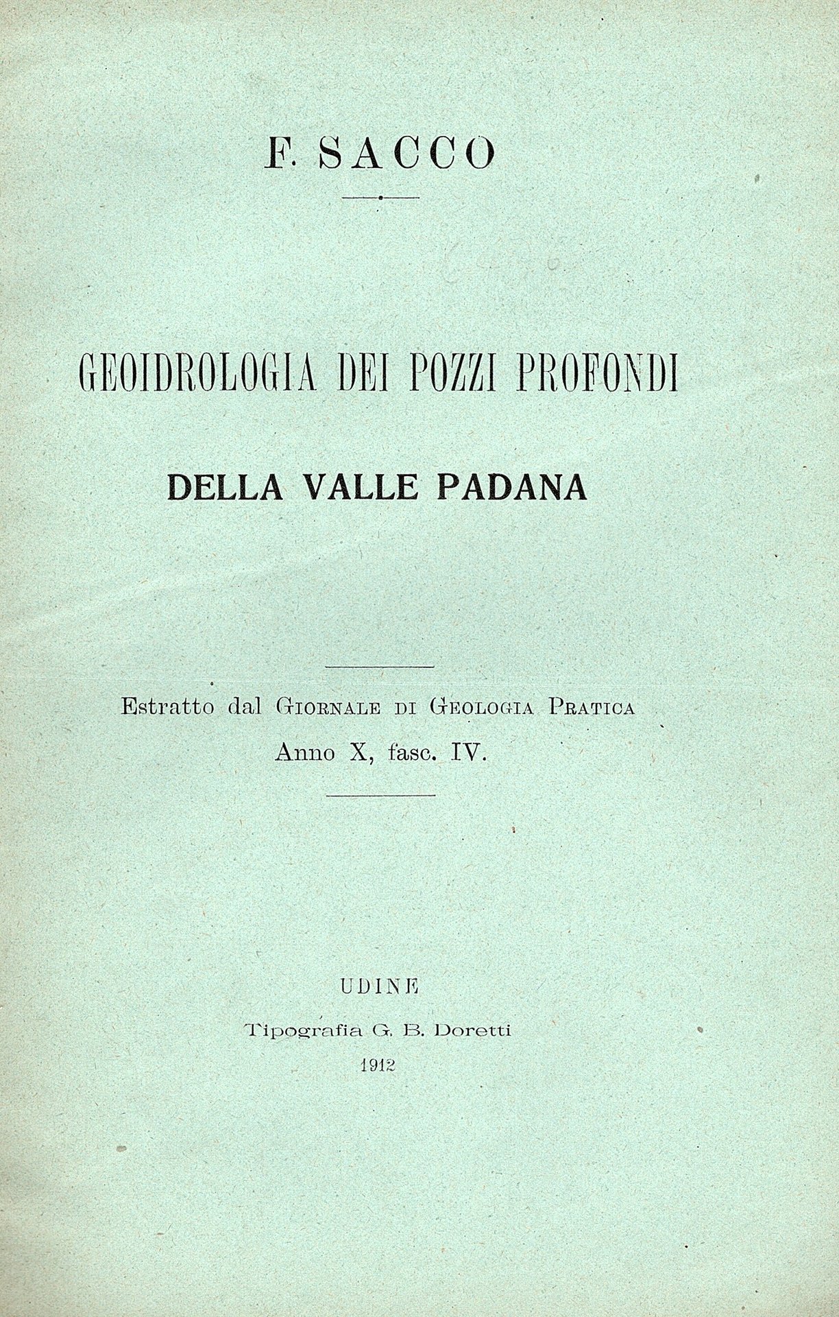 Geoidrologia dei pozzi profondi della Valle Padana Estratto dal Giornale di Geologia pratica. Anno X, Fasc. IV