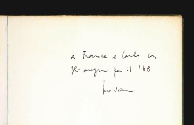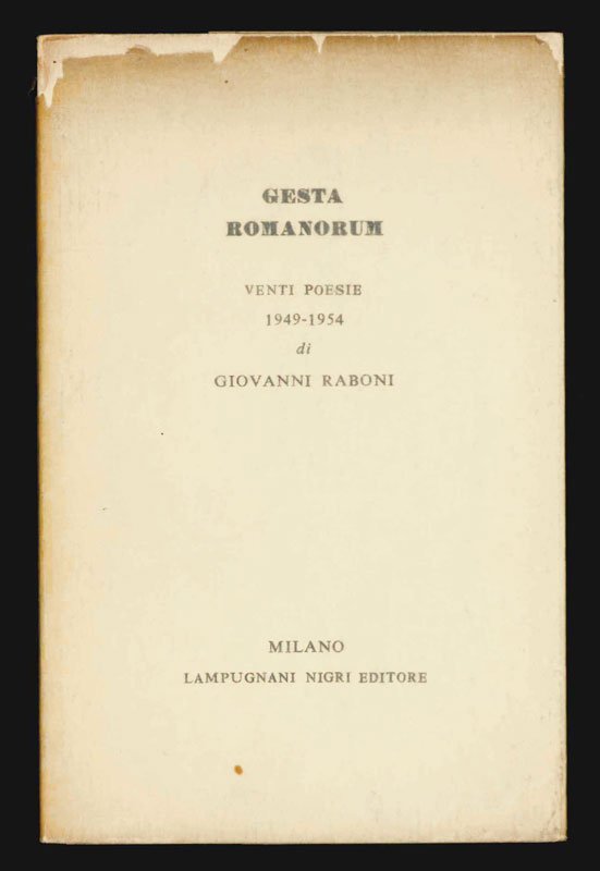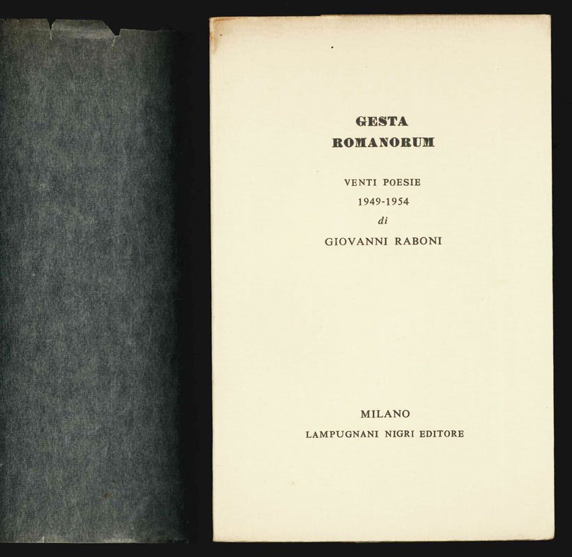 LIBROEdizione originale.CON AUTOGRAFO.Mancanza all’angolo superiore del pergamenino ma nel complesso ottimo esemplare pregiato dalla dedica autografa dell’autore «con gli auguri per il ’68».TIratura di sole 99 copie numerate per questa raffinatissima placchetta poetica stampata a ridosso delle festività natalizie del 1967/68. In «Gesta romanorum» — omaggio all’Adrian Leverkühn di Thomas Mann — il poeta torna alla sua produzione giovanile, già recuperata parzialmente nell’appendice delle «Case della Vetra»: le poesie qui pubblicate sono del tutto inedite e collocano questo libro al di fuori dello sviluppo poetico contemporaneo di Giovanni Raboni.