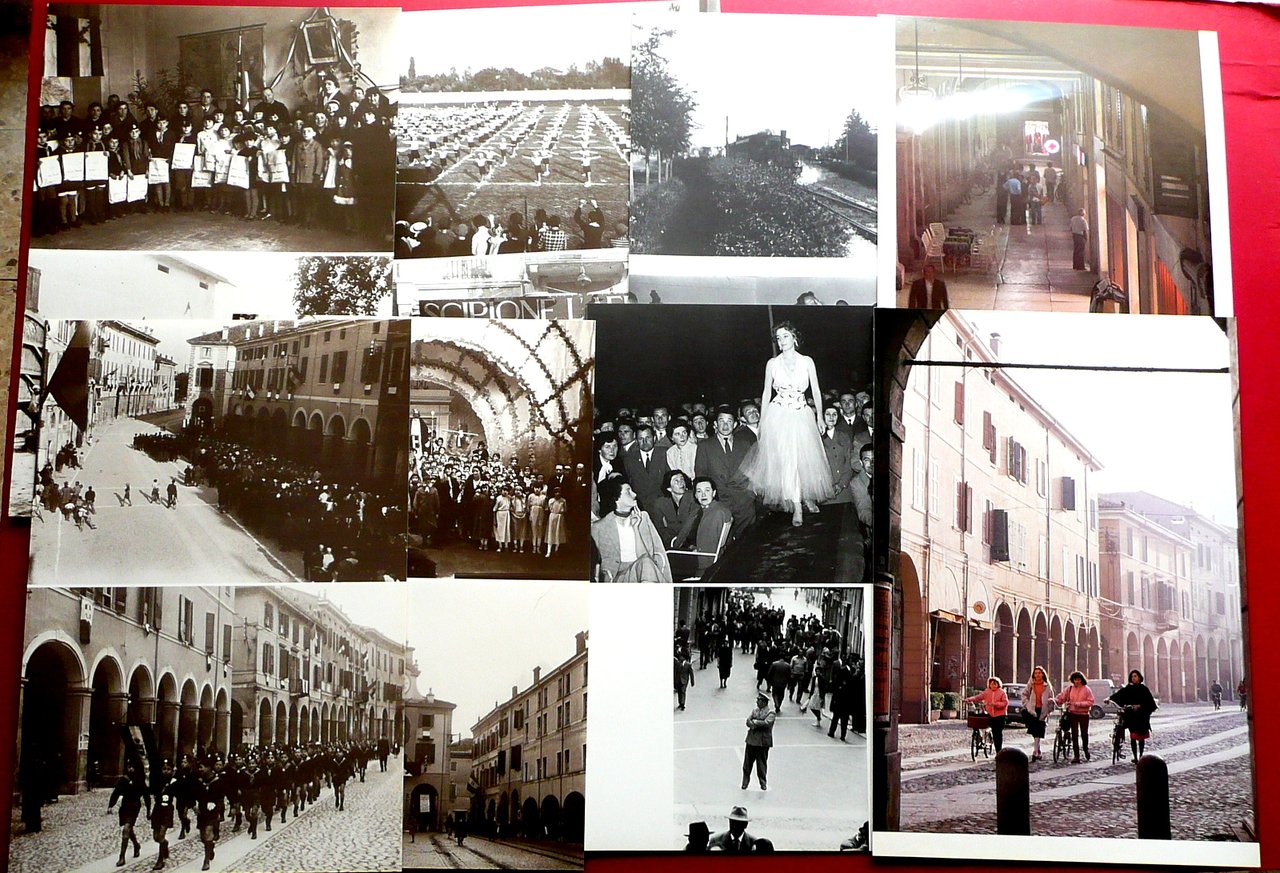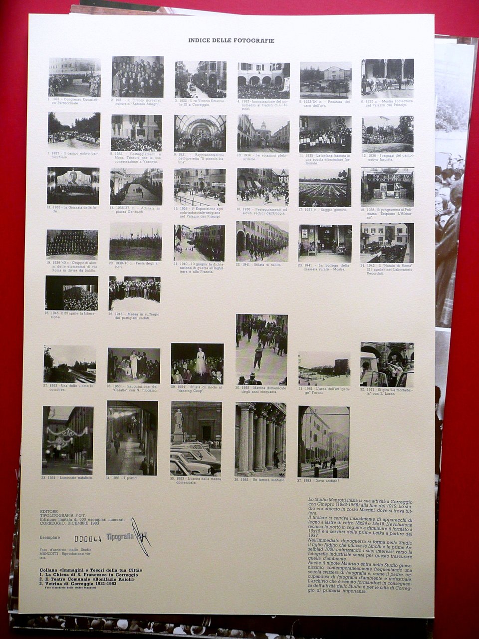 Cartella (37 tavole fotografiche), Vetrina di Correggio 1921 - 1983 Foto d'archivio dello Studio Manzotti Testi di Alberto e Massimo Ghidini Tipolitografia F.G.T., Correggio 1983; cartella costituita da un fascicolo di pp. 8 non num., a fogli sciolti, e da 37 belle tavole fotografiche in b/n; fascicolo e fotografie sono inseriti entro cartella ed. in cartoncino con titolo al dorso. Cm 47x32,5. Condizioni di conservazione Fotografie e fascicolo in ottime condizioni, pressoché come nuovi. Cartella ed. con alcune piccole lievi bruniture e minimi accenni di sporco; poche piccole ammaccature al dorso e agli angoli. Pregevole cartella fotografica, di notevole interesse storico (vedi foto colophon). Pubblicazione in tiratura limitata di 300 esemplari numerati; n/s 44. Completa di tutte le tavole fotografiche. SETT190.L17474 N