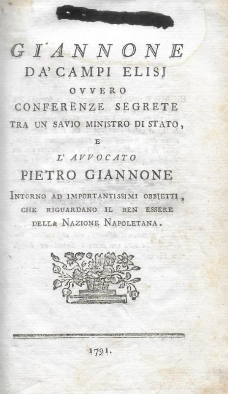 Giannone da'Campi Elisi ovvero conferenze segrete tra un savio ministro di stato e l'avvocato Pietro Giannone intorno ad importantissimi obbietti che riguardano il bel essere della Nazione Napoletana.