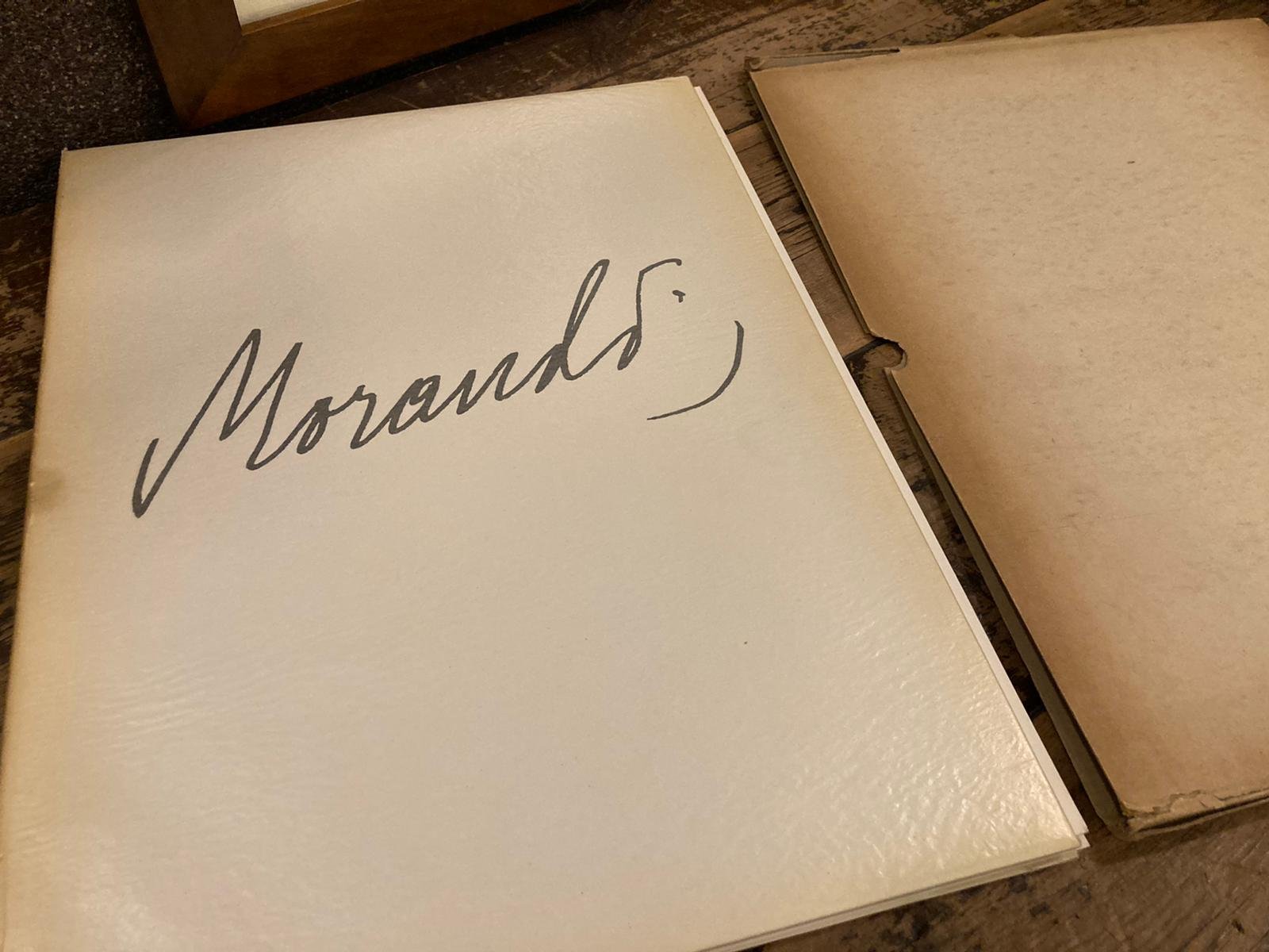In-folio (39x28mm), camicia editoriale in cartoncino protetta da velina con titolo al piatto anteriore, astuccio muto. Pp (6) di testo, 12 tavole a colori applicate, il tutto sciolto racchiuso nella camicia editoriale. Stampato su carta forte. Ex libris al frontespizio. Difetti all'astuccio ma più che buon esemplare. Elegante omaggio all'opera pittorica di Giorgio Morandi.