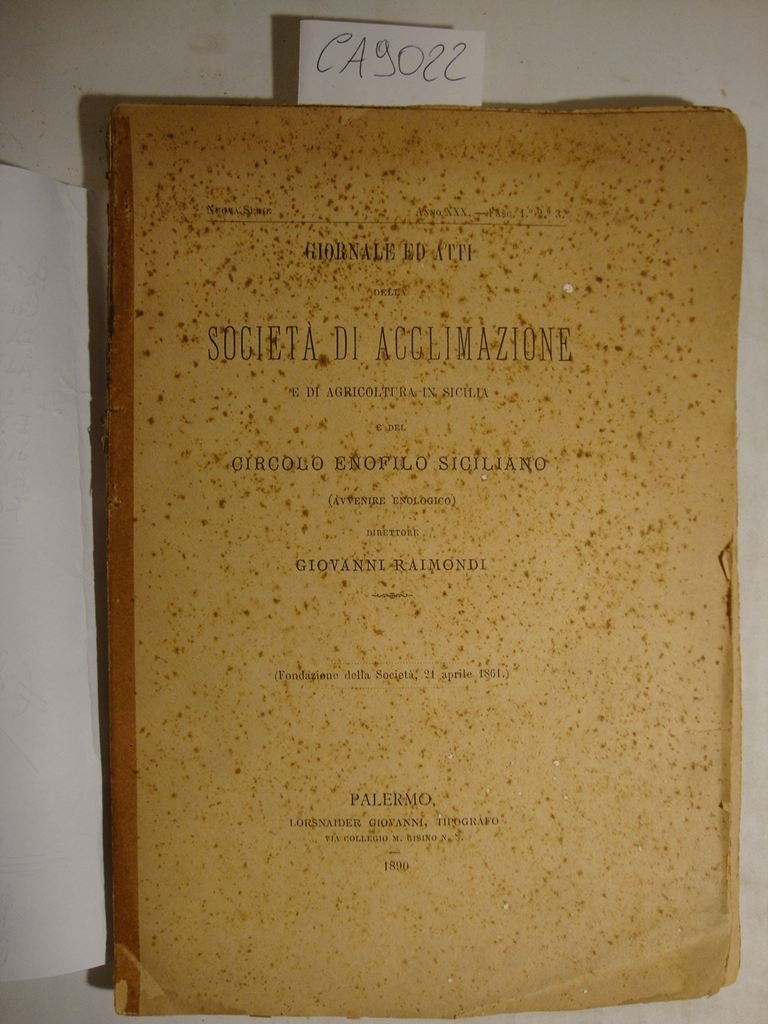 Giornale ed atti della Società di Acclimazione e di agricoltura in Sicilia e del Circolo Enofilo Siciliano (Avvenire Enologico) - Nuova Serie - Anno XXX - Fasc. 1°, 2°, 3°