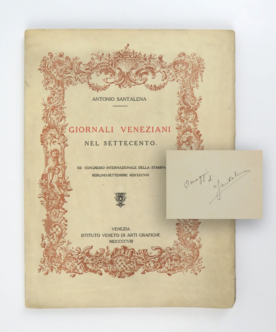 LIBROPrima edizione.CON AUTOGRAFO.Ottimo esemplare pregiato dall’invio autografo dell’autore «Omaggio di A. Santalena».Importante saggio storico-bibliografico, il primo sull’argomento, impreziosito da numerose riproduzioni in facsimile di rare testate veneziane del XVIII secolo.