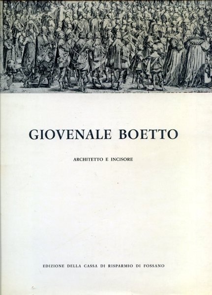 In-4°, pp. 96 di testo, legatura editoriale t. tela con sovraccoperta riproducente un'incisione del Boetto. 236 riproduzioni fotografiche f.t. di incisioni, di dettagli architettonici e di planimetrie di edifici del Boetto, anche ripiegate. Sguardie illustrate. Ottimo stato. Edizione impressa in 3000 copie, di cui 500 non venali. Testi di Nino Carboneri e Andreina Griseri, schede di Carlo Morra, presentazione di Giorgio Barbero. Referenziale monografia sull'artista barocco fossanese, vissuto fra il 1603 e il 1678, completa del catalogo completo della sua opera architettonica e incisoria. 'Giovenale Boetto, intorno al quale esisteva finora una letteratura diseguale e lacunosa, riceve cpsì, da questa pubblicazione, il conforto di una testimonianza, oltre che autorevole per acutezza di giudizio critico, cospicua nella documentazione; egli torna a proporsi.con il suo eclettismo che innesta il segno mosso e grandioso di ispirazione barocca su quello pacato e razionale dell'architetto militare' (Giorgio Barbero).