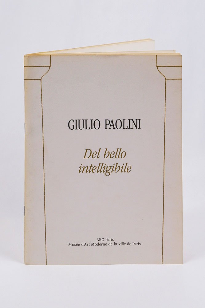 LIBROEdizione originale.Esemplare in ottime condizioni.La mostra, per cui venne stampato questo catalogo (allestita dal 24 novembre 1978 all’8 gennaio 1979 a Parigi) presentava al pubblico le prime tre parti del ciclo di cinque opere intitolate “Del bello intelligibile”. Si tratta di tre litografie stampate in oro, ciascuna composta da piccole fotografie, accompagnate da didascalie manoscritte a matita. Nel primo allestimento (che verrà poi replicato con varianti in altre occasioni, a Torino nel 1981 e a Stoccarda nel 1986) le opere sono disposte l’una accanto all’altra lungo una parete sulla quale sono disegnate una serie di colonne antiche (v. copertina e p. 23-24 del catalogo). Il catalogo stampato in italiano e in francese riproduce le opere in mostra, alcuni disegni legati alle fasi preparatorie ed è introdotto da un testo di Suzanne Pagé. Vale la pena riportare qui la definizione di “intelligibilità” così come la descrive Paolini in “La verità in quattro righe e novantacinque voci”: «È la misura che rende comprensibile una mancanza: in questo senso è curioso come un’opera sia lì per esserci e allo stesso tempo non possa svelarsi del tutto». (p. 103).Fondazione Paolini, scheda dell’opera e del catalogo (online); G. Maffei, Arte Povera 1966-1980 - Libri e documenti - Books and documents, Mantova, Corraini, 2007, p. 143.