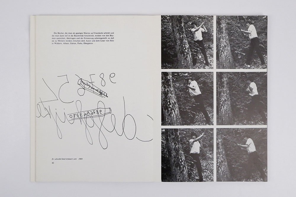 LIBROEdizione originale. Ottimo esemplare (normali abrasioni non deturpanti al dorso e lievi segni d’usura ai piatti, carte e tagli fraschi e puliti).Molto raro. Catalogo in lingua tedesca della mostra dell’artista Giuseppe Penone - esponente di spicco del movimento Arte Povera - presso la Staatliche Kunsthalle di Baden-Baden del 1978 (dal 28 gennaio al 26 febbraio), a cura di Hans Alber Peters. Oltre alle riproduzioni fotografiche delle opere di Penone (con fotografie di Paolo Mussat Sartor, Paolo Pellion di Persano e Dina Carrara), il catalogo raccoglie testi del curatore Hans Albert Peters, dello storico dell’arte Ingo Bartsch e dello stesso artista piemontese permettendo di attraversare l’evoluzione della sua arte nell’arco di un decennio e il formarsi del suo mondo. Un mondo - come scrive Tim Ingold in uno dei saggi contenuti in «Giuseppe Penone. The Inner Life of Forms» - «dove il respiro si solidifica ma i polmoni si vaporizzano, dove l’ombra è un corpo e il corpo un’ombra [.] dove gli alberi crescono dall’alto verso il basso e dal fuori al dentro, dove questi stessi alberi ci guardano, ci prendono per mano, e persino ci mandano lettere [.]».Cfr. T. Ingold “In the Shadow of Tree Being: a Walk with Giuseppe Penone”, vol. I “Essays”, in “Giuseppe Penone. The Inner Life of Forms”, a cura di C. Basualdo, New York, Gagosian, 2018, pp. 61-80; G. Maffei, “Arte povera 1966-1980 - Libri e documenti - Books and documents”, p. 155.