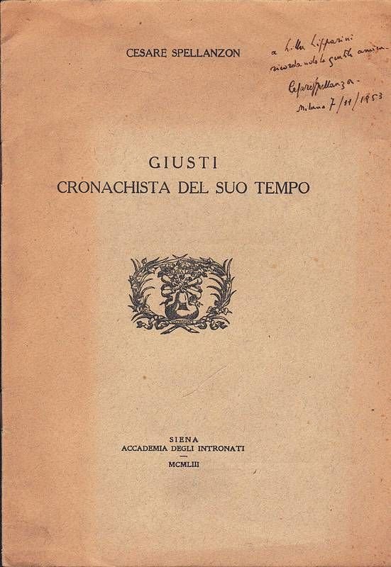 In-8°, legatura editoriale spillata, pp. 6 + 2 bianche. Estratto dal 'Bullettino Senese di Storia Patria'. All'angolo superiore destro del piatto anteriore dedica autografa firmata dell'autore. Leggere bruniture, ed altre marginali tracce del tempo. Cesare SPELLANZON, giornalista e storico. Costretto sotto il fascismo ad abbandonare la professione giornalistica, si dedicò a studî storici, soprattutto risorgimentali. Fra le sue opere principali: Il vero segreto di re Carlo Alberto (1953), in cui insisteva sulla responsabilità del re sabaudo per la sconfitta subita nella prima guerra di indipendenza, e la Storia del Risorgimento e dell'unità d'Italia (rimasta interrotta al 1848, 5 voll., 1933-50 e quindi continuata da E. Di Nolfo). Rientrato nel giornalismo dopo la seconda guerra mondiale, collaborò attivamente al Corriere della sera e ad altri giornali italiani e stranieri. (Treccani)