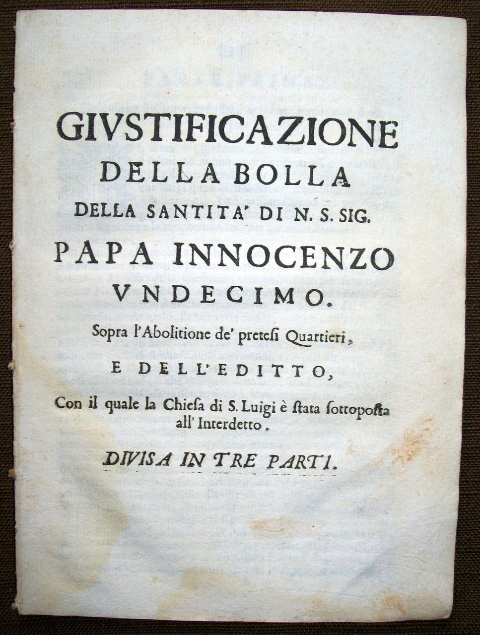 Giustificazione della Bolla della Santità di N.S. Sig. Papa Innocenzo Undecimo. Sopra l'abolizione de' pretesi quartieri, e dell'editto, con il quale la chiesa di S. Luigi è stata sottoposta all'interdetto. Diuisa in tre parti