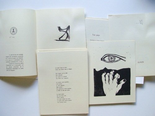 1 des 205 ex. num. sur Hollande à la cuve signé de l’artiste, 1 vol. in-4, 17 ff. repliés en cahiers sous chemise cartonnée gravée en creux, ill. noir et blanc, François Peltier éditeur, Bruxelles, 1977. Etat satisfaisant (lég. rouss. sur l’ensemble de la chemise, bon état par ailleurs avec feuillets très bien conservés) pour cet ouvrage illustré et typographié personnellement par l’auteur. Petite singature de l'auteur. Il s’agit d’une oeuvre de jeunesse de l’artiste, qui n’obtint son diplôme de l'Académie Royale des Beaux-Arts de Bruxelles que l’année suivante (1978). L’ouvrage a été produit sur les presses de la Manufacture d’Estampes et de Livres d’Art de Bruxelles. Une oeuvre intéressante. Peu courant.
