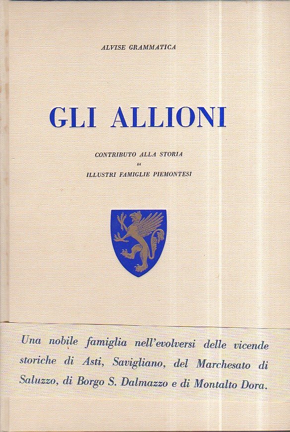 In-4°, pp. X, 137, (2), legatura t. tela edit.oriale con stemma degli Allioni impresso in oro e in blu al piatto. Ripiegata f.t., riproduzione della carta del Piemonte compresa nel 'Theatrum Orbis Terrarum' dell'Ortelius. 25 tavv. b.n. e a colori f.t. Ottimo stato. Edizione di soli 1000 esemplari numerati (n° 528), impressa con caratteri bodoniani. 'Una nobile famiglia nell'evolversi delle vicende storiche di Asti, Savigliano, del Marchesato di Saluzzo, di Borgo San Dalmazzo e di Montalto Dora', recita la fascetta editoriale.