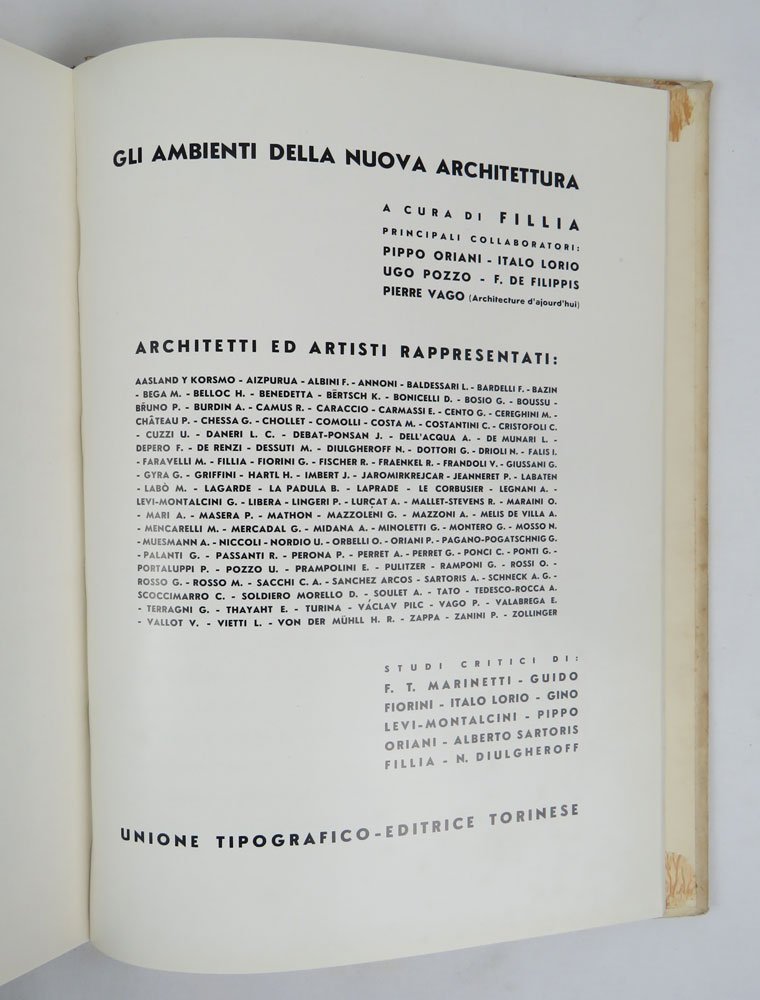 LIBROEdizione originale.Tracce del tempo al cartonato; interno perfetto.Contiene scritti di vari futuristi sull'architettura, con focus sull’interior design, preceduti da una prefazione di Marinetti. Straordinario l’apparato iconografico, esaltato dal formato in 4°, con moltissime fotografie in bianco e nero d’interni d’epoca, e dieci tavole a colori. Preziosa la sezione finale sulla «Plastica murale», di cui vengono offerti tutti i materiali precedentemente utilizzati per il catalogo della mostra e le notizie stampa.Bibl.: Cammarota, Futurismo, 201.11. Salaris, Bibliografia, p. 38