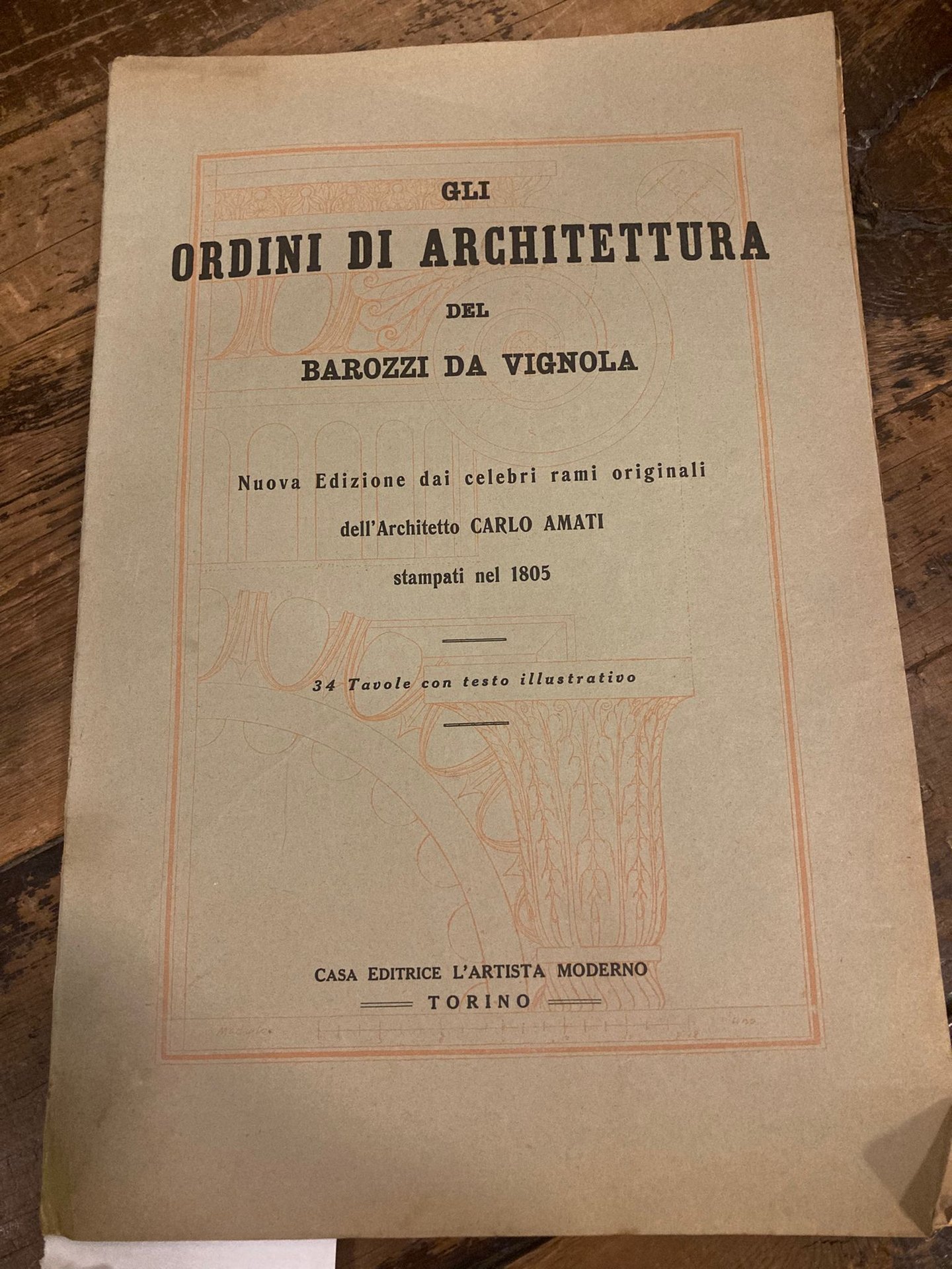 In-4° (34x23 cm), pp. (4), 34 tavole con didascalie a più di pagina e testo esplicativo a fronte, brossura editoriale con titoli in nero al piatto anteriore figurato in rosso. Minimi difetti alle cuffie e a poche pagine interne ma più che buon esemplare Non comune ristampa primonovecentesca di questa riedizione curata dall' Amati delle tavole del classico trattato del Vignola.