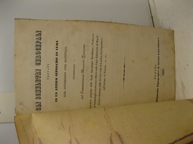 In 16, pp. 16. Br. muta. Saggio relativo al ritrovamento di scheletri a Cuma con volti di cera. 'Bibliotheca philologica', p. 6.