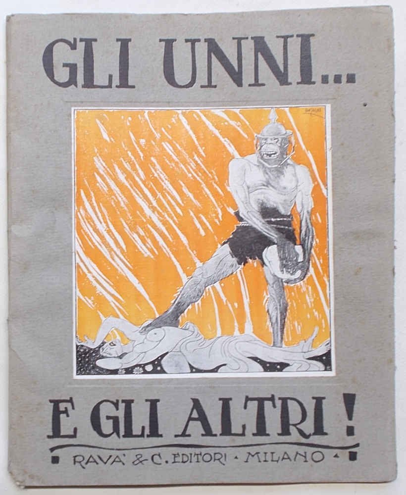 In 4° (cm. 36 x 29); pagg. (10); 34 tavole a colori; leggera originale con illustrazione a colori applicata firmata da Bonzagni; all'interno i fogli sono fissati dal nastro originale in raso. Qualche lieve sentore d'umido, ma ottimo esemplare. VG. ** Celebre opera che raccoglie lavori di molti tra i migliori illustratori satirici dell'epoca: "pagine di amara irrisione. per maledire una torma cui l'orgoglio della forza e la vanità della scienza non insegnarono se non una più orrenda barbarie". Idee e motti di Giannino Antona-Traversi. Disegni di G. Ardy, A. Bonzagni, A .Cagnoni, L.D. Crespi, M. Dudovich, L. Dudreville, A. Mazza, E. Sacchetti, S.Tofano (Sto), R.C. Ventura. Sculture di V. Franco.