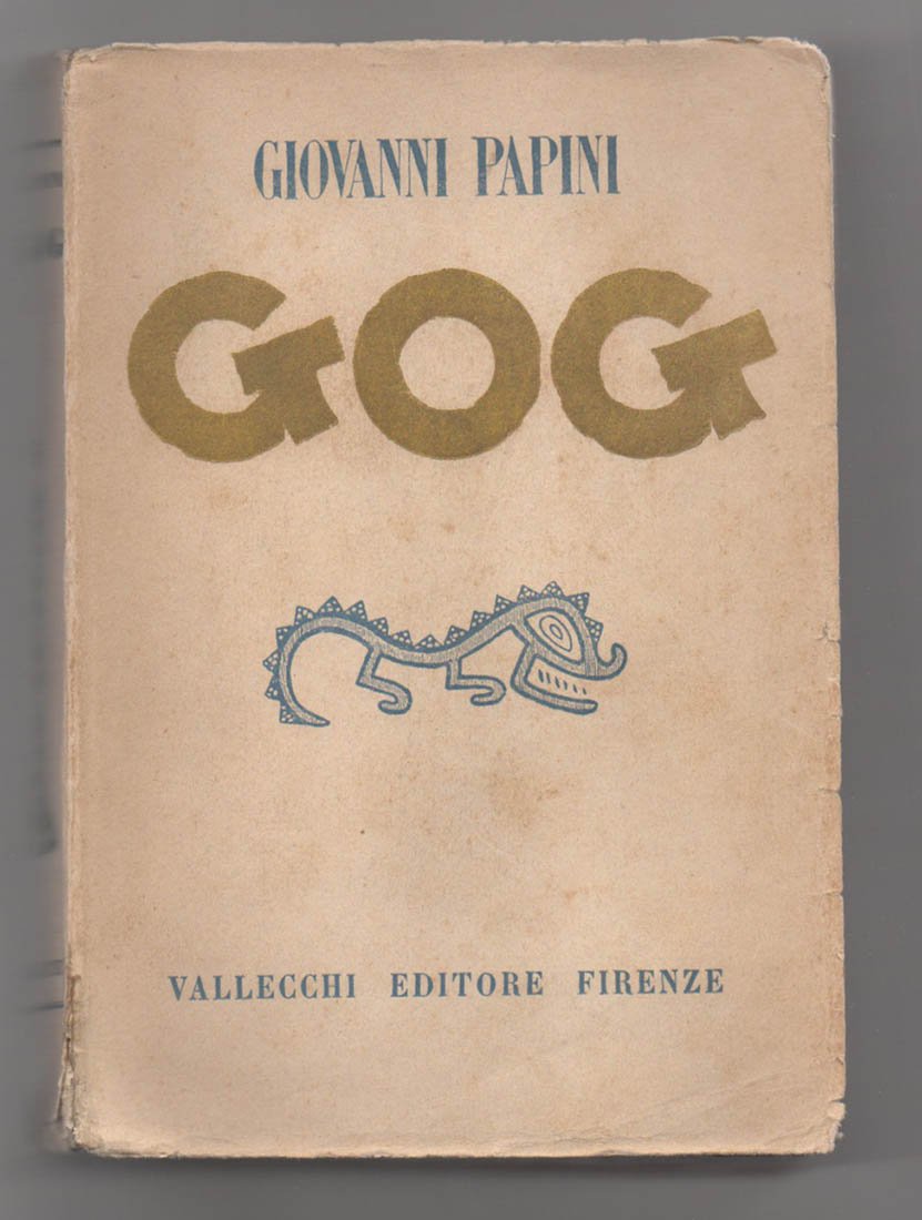 AUTOGRAFOPrima edizione.Esemplare in stato più che buono, con segni del tempo alla brossura.Romanzo satirico pubblicato dalla fiorentina Vallecchi nel 1931. Protagonista dei racconti scritti e narrati da Giovanni Papini è Gog, personaggio simbolo della dissipazione e della futilità del capitalismo moderno che l’autore così introduce: «Mi vergogno a dire dove ho conosciuto Gog: in un manicomio privato. Andavo lì spesso per far compagnia a un giovane poeta dalmata [.]. Un giorno di gran caldo che si parlava, io e il poeta, al nostro tavolino si avvicinò un altro ospite. Era un mostro sul mezzo secolo, vestito di verde chiaro. Alto ma fabbricato male [.]. Ignorantissimo volle essere iniziato alle più raffinate droghe d’una cultura in putrefazione. Già quasi sedentario volle conoscere tutte le patrie - lui senza patria vera. Animalesco d’origine e vocazione volle pagarsi tutte le forme dell’epicureismo cerebrale dei nostri tempi». Spirito inquieto, Papini dà voce con questo libro a una delle sue molte trasformazioni esistenziali: già fondatore di «La Voce» con Prezzolini nel 1908 e in seguito transfuga da quell’esperienza per dar vita, con Ardengo Soffici, a «Lacerba», negli anni Trenta lo scrittore e poeta fiorentino - dopo aver attraversato la fase della conversione religioso - radicalizzò ulteriormente le proprie pulsioni antimoderne e antidemocratiche e ad avvicinarsi in modo sempre più convinto - benché non sempre lineare - al fascismo.