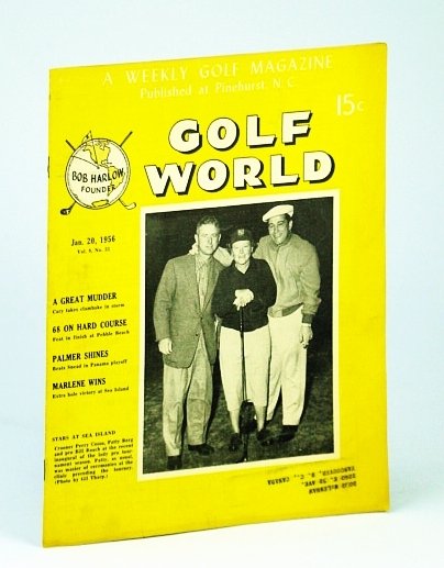 - Golf World - A Weekly Golf Magazine, Jan. (January) 20, 1956, Vol. 9, No. 33 - Cover Photo Singer Perry Como, Patty Berg, and Bil Roach Arnold Palmer and his wife with story about his, victory in Panama, Photo of Cary Middlecoff, winner of the Bing Crosby tournament, Photo of crowd on the 16th hole at Pebble Beach, Photo of the Boros family in the Pro Shop at the Mid Pines Club, where son Julius is the Pro, One-page ad for the Lectracar Duo golf cart by Sears, Roebuck & Co, Photo of Edgar A. Sweet, Nice photo of Marlene Bauer Hagge driving in tournament play, Photo of Mangrum in Golfcraft, Inc. ad, Photos of Dr. and Mrs. Seth W. Shields, and Lady Meek and Dr. Shields Sport Magazine Back Issues