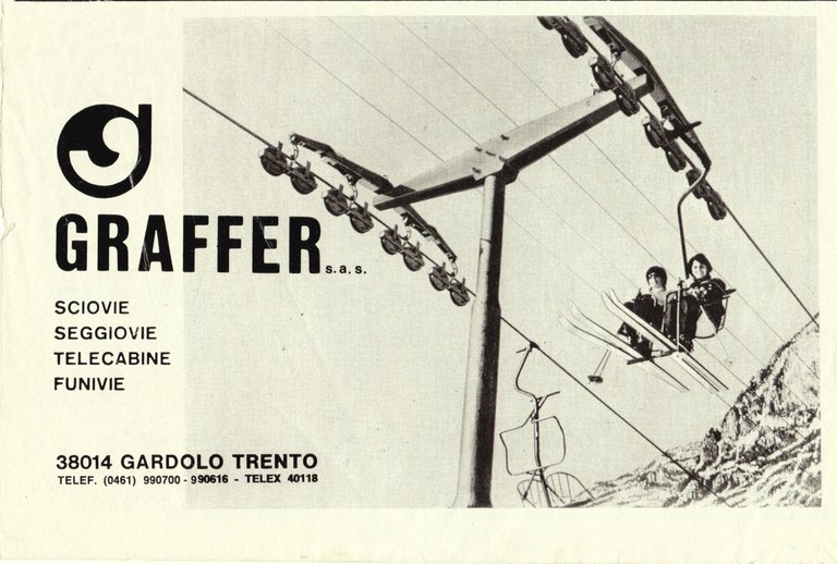 Graffer. Sciovie, seggiovie, telecabine, funivie. Advertising 1976