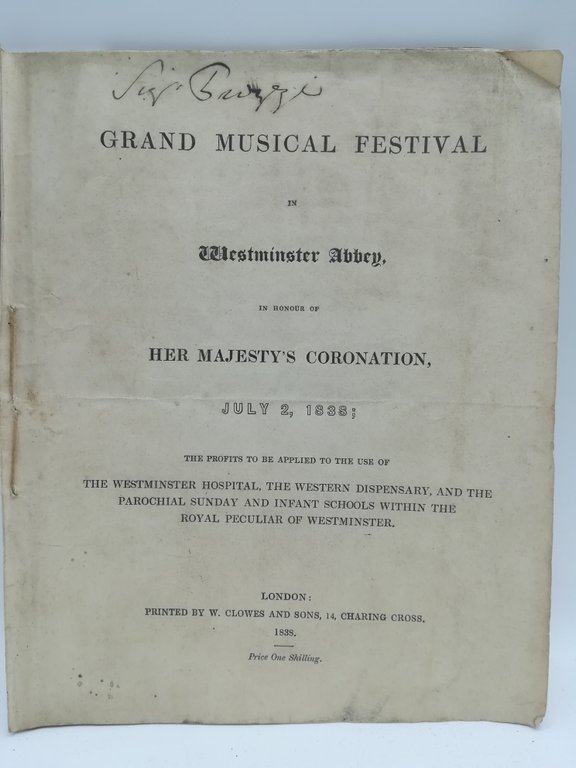 In 8 (cm 18 x 22,5), pp. 18 + (2). Firma al frontespizio "Sig. Puzzi" (si tratta di Giovanni Puzzi, il celebre virtuoso nello strumento del corno che si trasferi' in Inghilterra e il cui nome compare anche nella pubblicazione tra i musicisti presenti). Brossura rifatta con carta d'epoca. Programma del Grand Musical Festival, tenutosi presso l'Abbazia di Westminster il 2 luglio 1838, per celebrare l'incoronazione della regina Vittoria avvenuta il 28 giugno di quell'anno. I proventi andarono al Westminster Hospital. Tra i cantanti presenti figurano Giulia Grisi, regina dell'opera italiana, verso la quale la regina Vittoria nutriva una vera passione - cosi' come per la musica lirica italiana in generale - Giovanni Battista Rubini, Antonio Tamburini, Anna Bishop, Mary Shaw, Puzzi, e altri. Il gruppo vocale e strumentale presente era costituito da oltre 400 performers. Rarissimo (una sola copia presente alla Pierpont Morgan Library di New York).