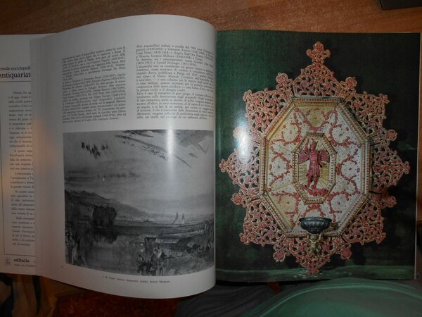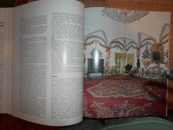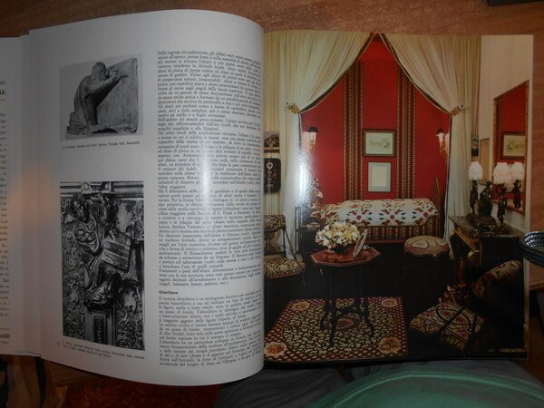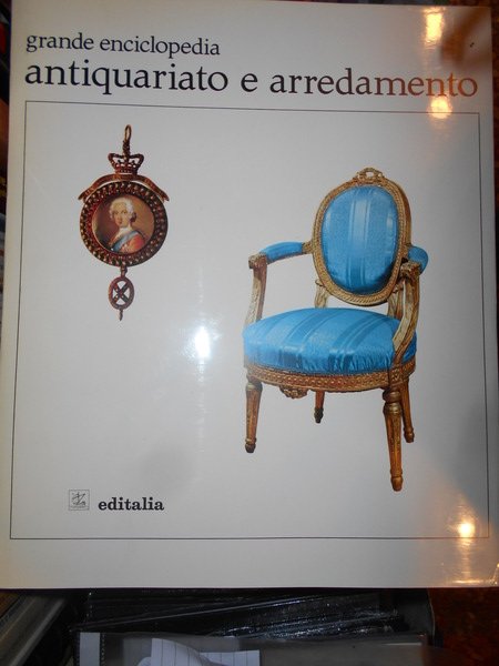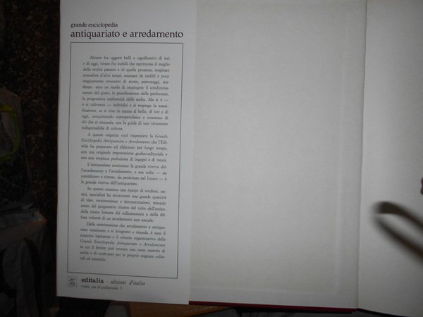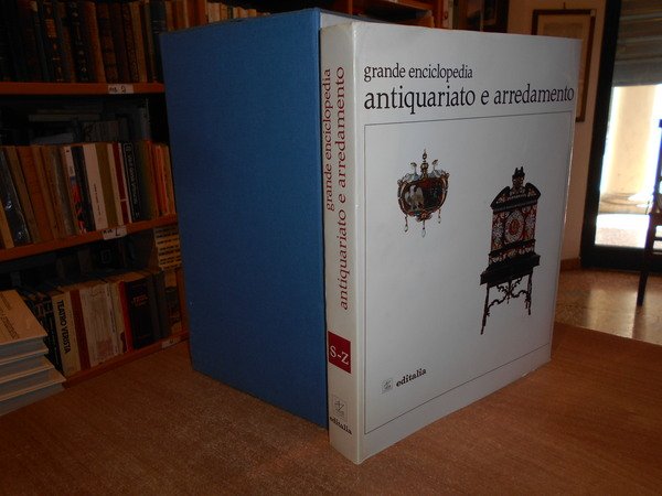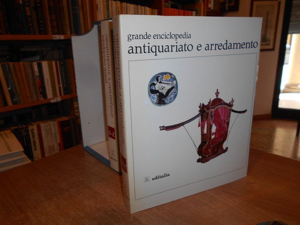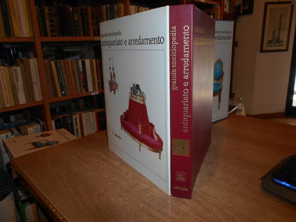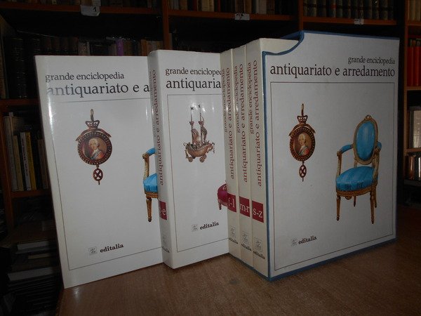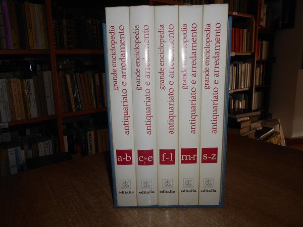 a cura di Vittorio Del Gaizo. Roma, Editalia, 1969. Grande Enciclopedia Antiquariato e Arredamento. 5 volumi in-4°, similpelle bordeaux con titoli in oro ai dorsi e sui piani, sovracopertine ill. a col. 307, (2) pp.; 314, (1) pp.; 296, (2) pp.; 296, (2) pp.; 288 + indice dei nomi. I volumi sono corredati da innumerevoli illustrazioni a colori e in bianco e nero anche a piena pagina. Volumi come nuovi. Custodia con fenditura all' angolo superiore. Pacco pesante. Stanzetta mob. a destra sotto.