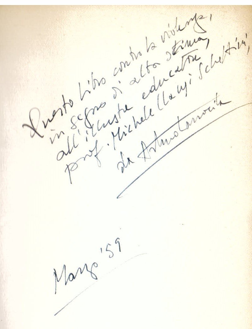 In-16°, pp. 243, (5), brossura editoriale con sovraccoperta risvoltata a tamburo. Dedica autografa dell'autore: 'Questo libro contro la violenza, in segno di alta stima, all'illustre educatore prof. Michele Clausi Schettini, da Arturo Lanocita marzo '59'- Il Clausi Schettini fu educatore e provveditore agli studi della città di Milano. Prima edizione.