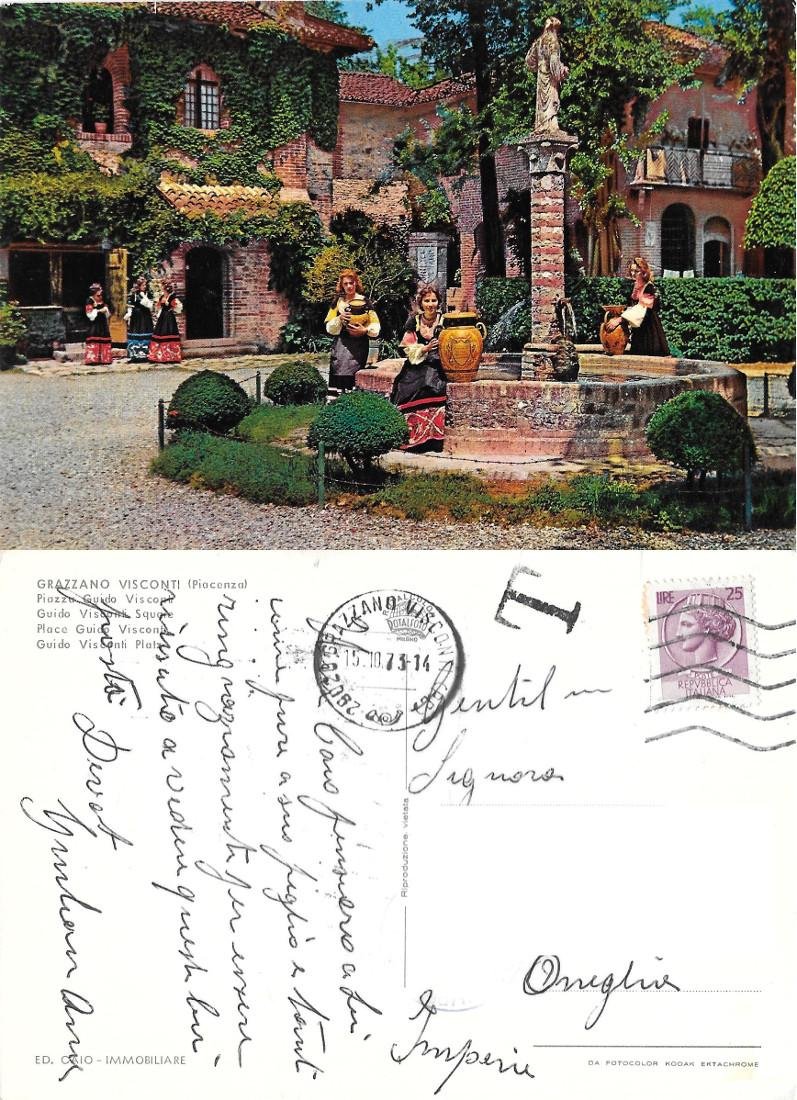Grazzano Visconti (PC). Piazza Guido Visconti. Viaggiata 1973
