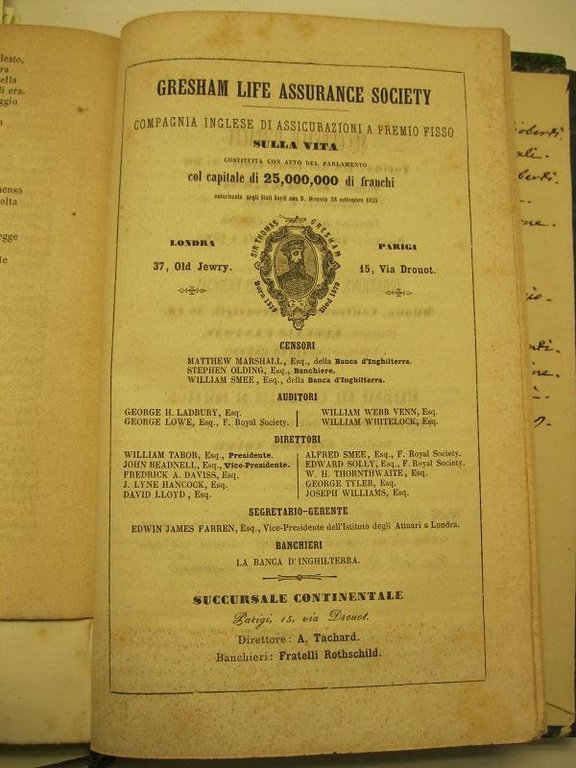 In 8, pp. 30. Br. rifatta con carta d'epoca. Testo di presentazione delle assicurazioni sulla vita della succursale italiana della compagnia inglese Gresham Life Assurance Society.