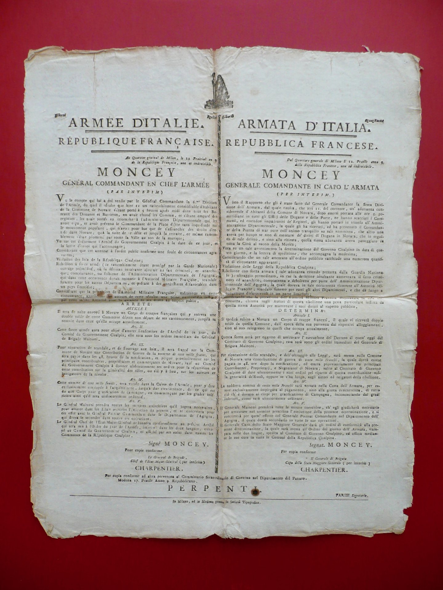 Grida, Armata d'Italia Repubblica Francese Moncey Generale Comandante in Capo l'Armata (per interim) Visto il raporto che gli è stato fatto dal Generale Comandante la Sesta Divisione dell'Armata, dal quale risulta, che ieri 11 del corrente, un'adunanza considerevole degli abitanti della Comune di Novara, doppo essersi portata alle ore 5 pomeridiane in tutti gli Uffici delle Dogane e delle Porte, ne hanno scacciati i Commessi [.]" Per la Società Tipografica, in Milano e in Modena 1802; margini alla forma; testo su due colonne; fregio inciso in b/n al margine sup. Cm 53,5x42. Condizioni di conservazione Esemplare ben conservato con tracce d'uso, pieghe di conservazione, alcune minime bruniture e piccoli lievi aloni, margini e angoli con qualche piccola pieghetta. Testo bilingue francese - italiano. SC03.D13743 N "