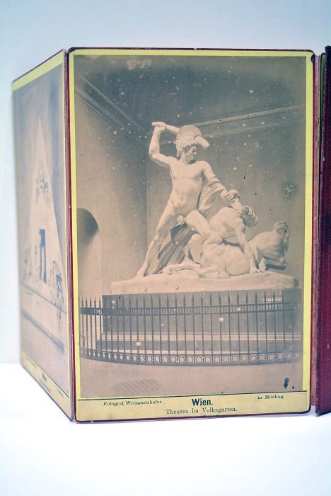10 photos originales reliées en accordéon. Les 2 premières sont reliées à l'envers. (12x16,5cm). Percaline rouge. Encadrements à froid. Titre doré. Taches et frottements surtout au plat inférieur. 2 planches détachées. Bon état. Donaukanal, Nordbahnhof, Opernhaus, Cursalon, Kärnthner-Ring, Stefanskirche, Votivkirche, Stadttheater, statues de Théseée (Volksgarten), monuments au prince Eugen et à l'empereur Charles.