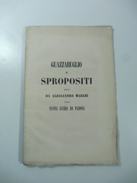 In 8 (cm 15 x 23,5), pp. 47. Brossura editoriale. Pubblicazione anonima, ma attribuita a Andrea Gloria, Antonio Isnenghi, Giuseppe Orsolato, Filippo Fanzago, che nell'introduzione si firmano come 'alcuni Padovani' che ricostruisce tutti gli errori fatti da Alessandro Marchi nella Guida di Padova pubblicata in quello stesso anno.