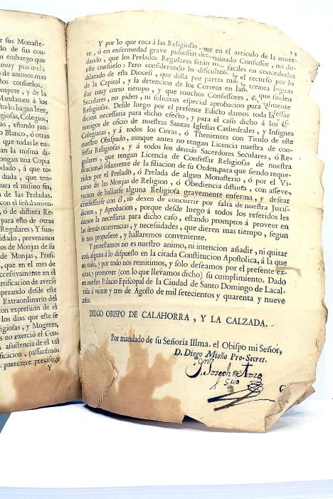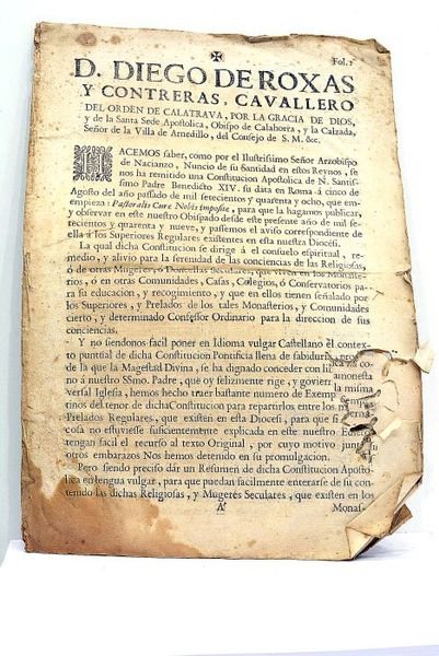 13 pages. (30 x 21 Cm). Broché. Feuillets écornés. Galeries de vers sur tous les feuillets avec manque de texte sur plusieurs pages. Rousseurs. Taches brunes. Lettre concernant les religieuses, notamment leur devoir de confesser. Signature de l'époque sur la dernière page.