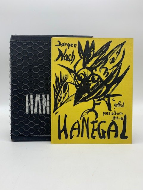 In 8 (cm 21 x 27,5), pp. (2 bianche) + (72) + (2 bianche). Cartonatura editoriale gialla con un'illustrazione in nero al piatto anteriore di Katarina Nash raffigurante un gallo (piccolissima macchietta d'inchiostro al piatto posteriore). Presente una custodia in cartone grigio con la scritta "Hanegal" eseguita a mano, mediante stencil di colore bianco, rivestita da una rete metallica per polli. Edizione di 750 copie numerate (ns. copia 509) con firma degli autori in blu al verso della seconda carta. Con litografie a colori eseguite da J. V. Martin. Libro d'artista con le poesie di Jorhen Nash in lingua danese. Jorgen Nash e J. V. Martin fecero parte dell'Internazionale situazionista che poi abbandonarono l'anno successivo, nel 1962.