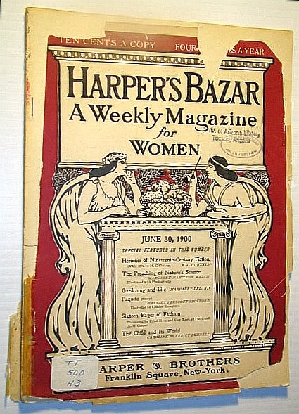• Harper's Bazar (Bazaar) - A Weekly Magazine for Women, June 30, 1900 - New Effects in Lace Waist Trimmings Illustration of Emma, Woodhouse in "Emma", Heroines of Nineteenth-Century Fiction (VI), Fate's Tablet, The Preaching of NAture's Sermon, Gardening and Life, Paquito, Books and Writers, The Meloon Farm (continued), Midsummer Fashions, New Effects in Lace Waist Trimmings, Cut Paper Patterns, Hydiene for the Stout - interesting vintage article on weight, control, My Friend, Home Work in Embroidery, The Child and its World - II - The Child's Dress, Recipes for Warm Days, News of the Women's Clubs - with photos of Mrs. Charles Denison, of New York, and Miss Margaret J. Evans, of Minnesota, Gala Luncheons for July, A Veranda Living-Room, Buying for the Household Women's Issues Magazine Back Issues, Fashion