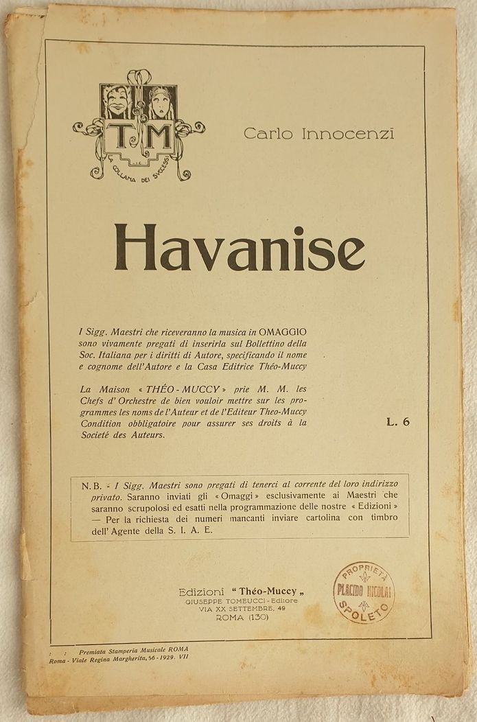 Partitura completa per orchestra del 1929 della melodia "Havanise" di Carlo Innocenzi. Copertina morbida editoriale. GENERE: Valzer STRUMENTI: pianoforte; violini; flauto; tromba; trombone; batteria, sassofono, viola, violoncello, contrabasso, flauto, clarinetto ANNO: 1929 DIMENSIONI: In 8. cm 27x17 PAGINE: pp. 17 CONDIZIONI: Buone condizioni. Alcune pagine interne strappate. Ex libris sulla copertina Beautiful score of one song, a complete score for orchestra of the melody "Havanise" by Carlo Innocenzi.<BR>MUSIC: Waltz STRUMENTI: piano; violins; flute, trumpet, trombone drums, saxophone; viola, violoncello, contrabbass, flute, clarinet YEAR: 1929 SIZE: In 8. cm 27x17. PAGES: pp. 17 CONDITIONS: Good conditions. Some internal pages are teared NOTES: Ex libris in the cover and in some pages<BR><BR>
