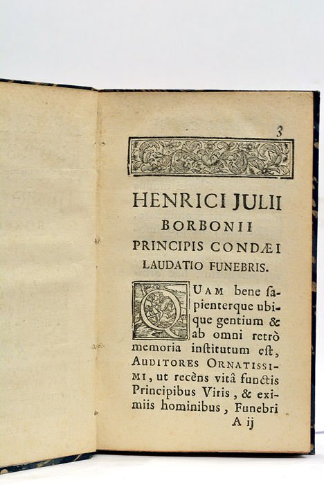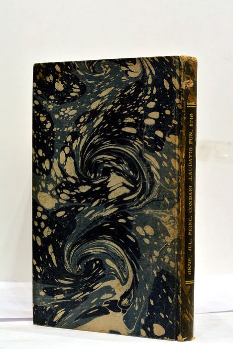 84 pages. (16x9,5 Cm). Cartonnage postérieur à la Bradel. Pièce de titre au dos. Coins et coiffes un peu émoussés. Éloge funèbre de Henri-Jules de Bourbon, Prince de Condé, prononcé dans un collège jésuite de Dijon par un prêtre de la Société. Très bon exemplaire à part quelques feuillet légèrement bruni.