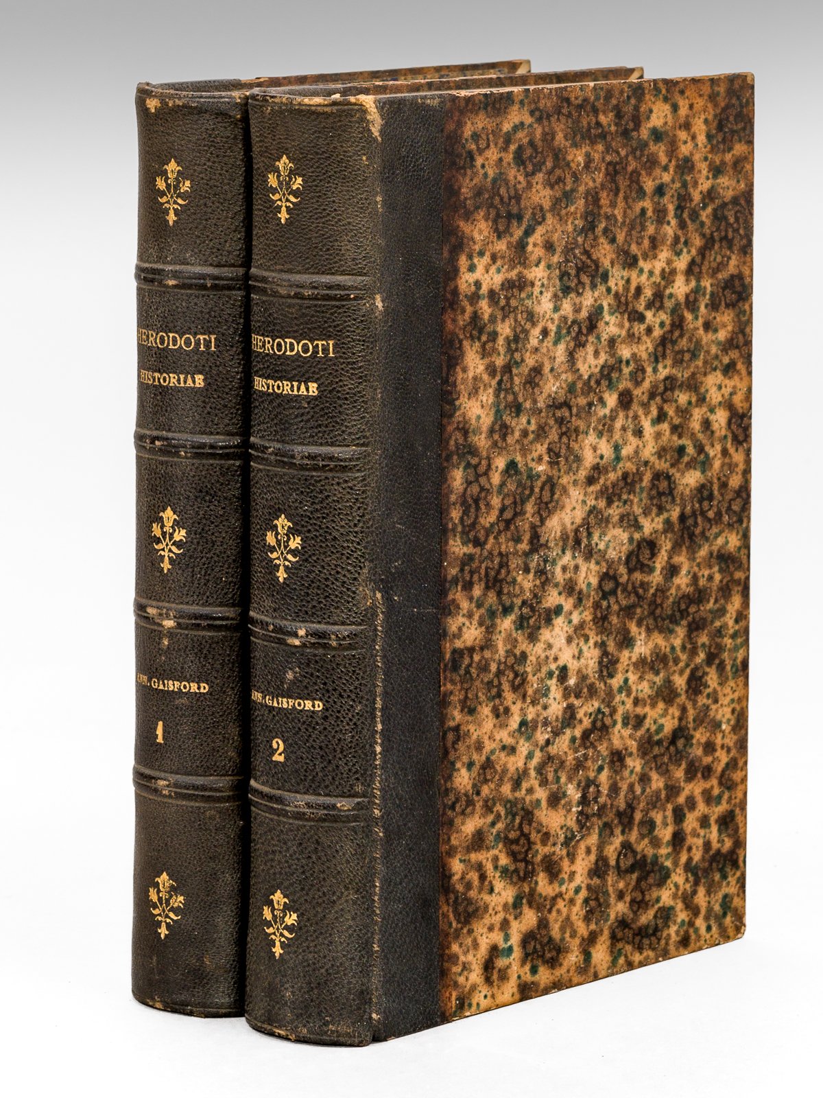 Denuo contulit reliquam lectionis varietatem commodius digessit Annotationes variorum adjecit Thomas Gaisford, 2 vol. in-8 reliure de lépoque demi-chagrin noir, dos à 4 nerfs, Excudebant S. et J. Collingwood, Impensis Josephi Parker, Oxonii [ Oxford ], C. et W.B. Whittaker et C. et J. Rivington, Londini [ London ], J. Deighton et Filiorum, Cantabrigiae, 1824, 2 ff., 565 pp. ; pp. 566-1138 et 35 ff. Il s'agit des deux volumes de notes qui prennent suite aux deux premiers volumes de la présente édition proposant le texte ; les 2 présents volumes portent néanmoins en tomaison Tomes 1 et 2. Bon état (dos lég. frotté). Texte en grec et latin. Brunet, II, 410