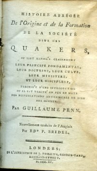 En peu de mots des dispensations anterieures de Dieu aux hommes. Nouvellement traduite de l'Anglois par Ed.d P. Bridel. In-12° (12.6x7.4 cm), pp. (6), IV, 5-199, (3), cartonatura muta azzurra coeva con dorso in pergamena. Diffusi aloni e fioriture. Seconda edizione francese, ma prima edizione della traduzione di Bridel (la prima edizione assoluta fu pubblicata a Londra, T. Sowle, 1694) di 'A brief account of the rise and progress of the people called Quakers', la più importante fonte storica sul Quaccherismo. William Penn (Londra, 1644-Ruscombe, 1718), figlio dell'ammiraglio omonimo, fondò sul Delaware lo stato della Pennsylvania, di cui fu governatore e che da lui trasse il nome, e vi costituì uno stato cristiano di tipo Quacchero ('Il Santo Esperimento'), regolato da una costituzione che garantiva la libertà di coscienza e prevedeva un governo eletto a suffragio universale. La capitale, fondata nel 1682, ricevette il nome augurale di Philadelphia ('Amor fratermo'). Nel 1712 egli vendette la colonia all'Inghilterra per 280.000 sterline. Sabin 59705, Monglond, I, 1144. Quérard, VII, 9.