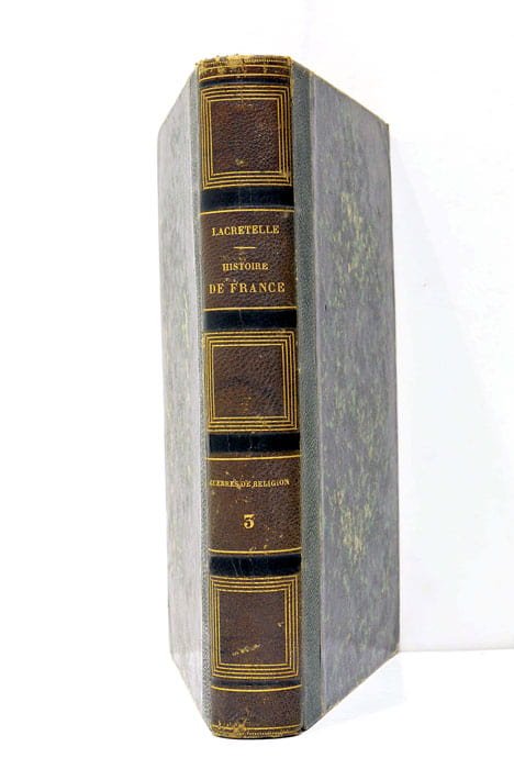 Tome III seul. 494 pages. 2 feuillets. (20,5x13cm). Demi-cuir. Couverture frottée et coins émoussés. Dos lis orné avec titre, auteur et tomaisnon en lettres dorées. Publié à Paris en 1844, ce troisième tome de l'œuvre de Charles Lacretelle s'inscrit dans un contexte historiographique où l'intérêt pour les périodes de conflit et de transformation est marquant. L'auteur, reconnu pour son approche détaillée des événements, se penche ici sur une période tumultueuse de l'histoire de France, marquée par des affrontements religieux qui ont façonné le paysage politique et social du royaume. Papier légèrement bruni avec petites atches éparses sans gravité. Bien conservé.