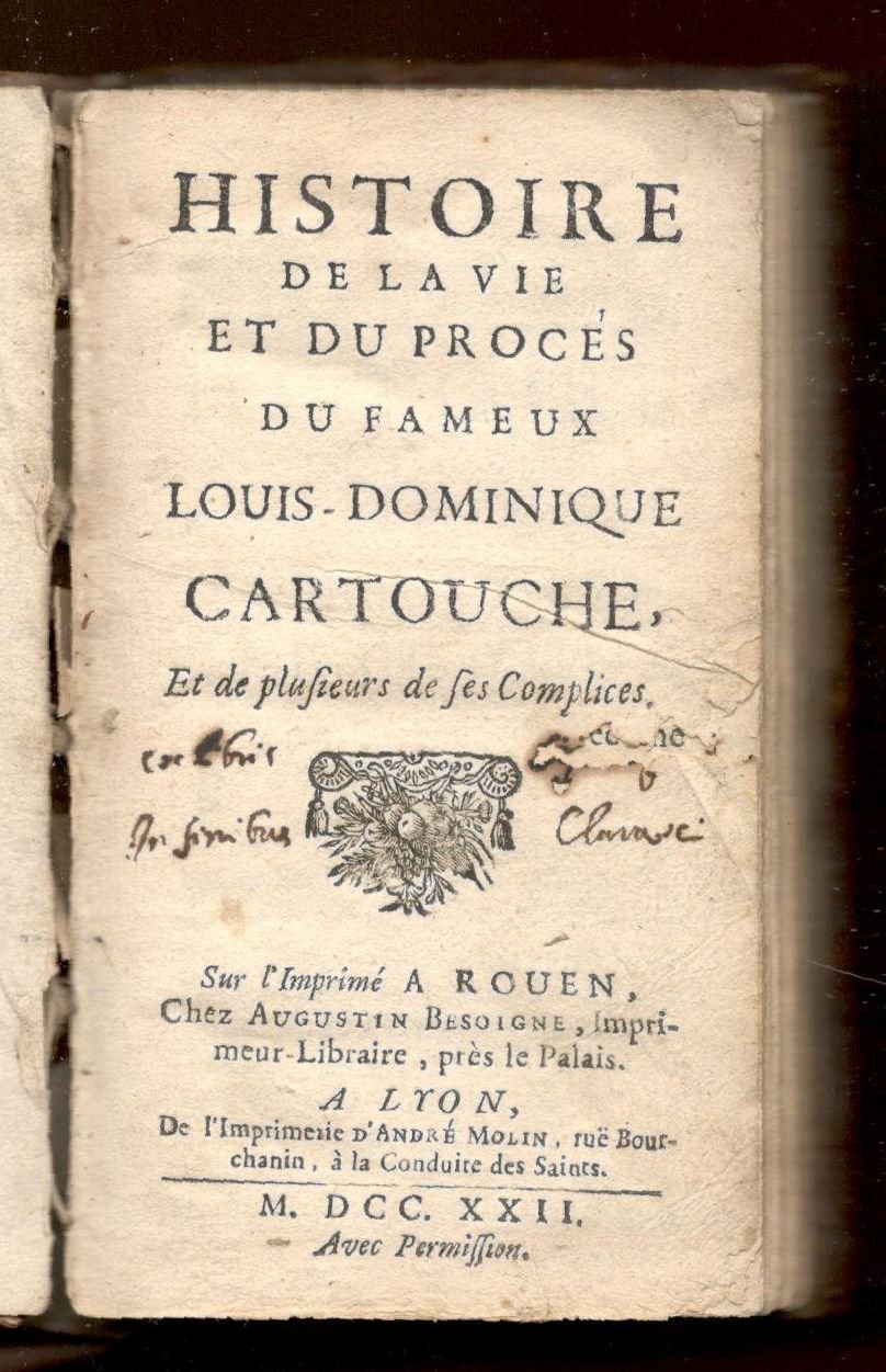In 12°, pp. 122. Vitello dell'epoca. Dorso a nervetti con fregi oro (un po' consumati). Piccolo buco sul frontespizio per via dell'acidità dell'inchiostro antico che ha corroso una nota di possesso. Il celebre bandito Louis-Dominique Bourguignon, detto Cartouche venne giustiziato a Parigi il 28 novembre 1721.