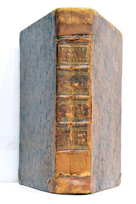 XVI. 559 pages. (i.e. 563). 2 feuillets. 14 planches gravées hors-texte. (19,5x12,5 Cm). Pleine basane de l’époque. Dos à nerfs orné. Coiffes et coins renforcés anciennement émoussés. Dos et plats frottés. Edition Originale de cet ouvrage historique sur les cérémonies de sacre royal, illustré de 14 planches hors-texte représentant des costumes. Déchirure sans manque à une planche.Taches et rousseus. Quelques traces de plis.