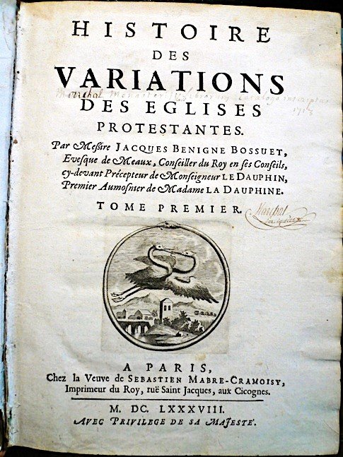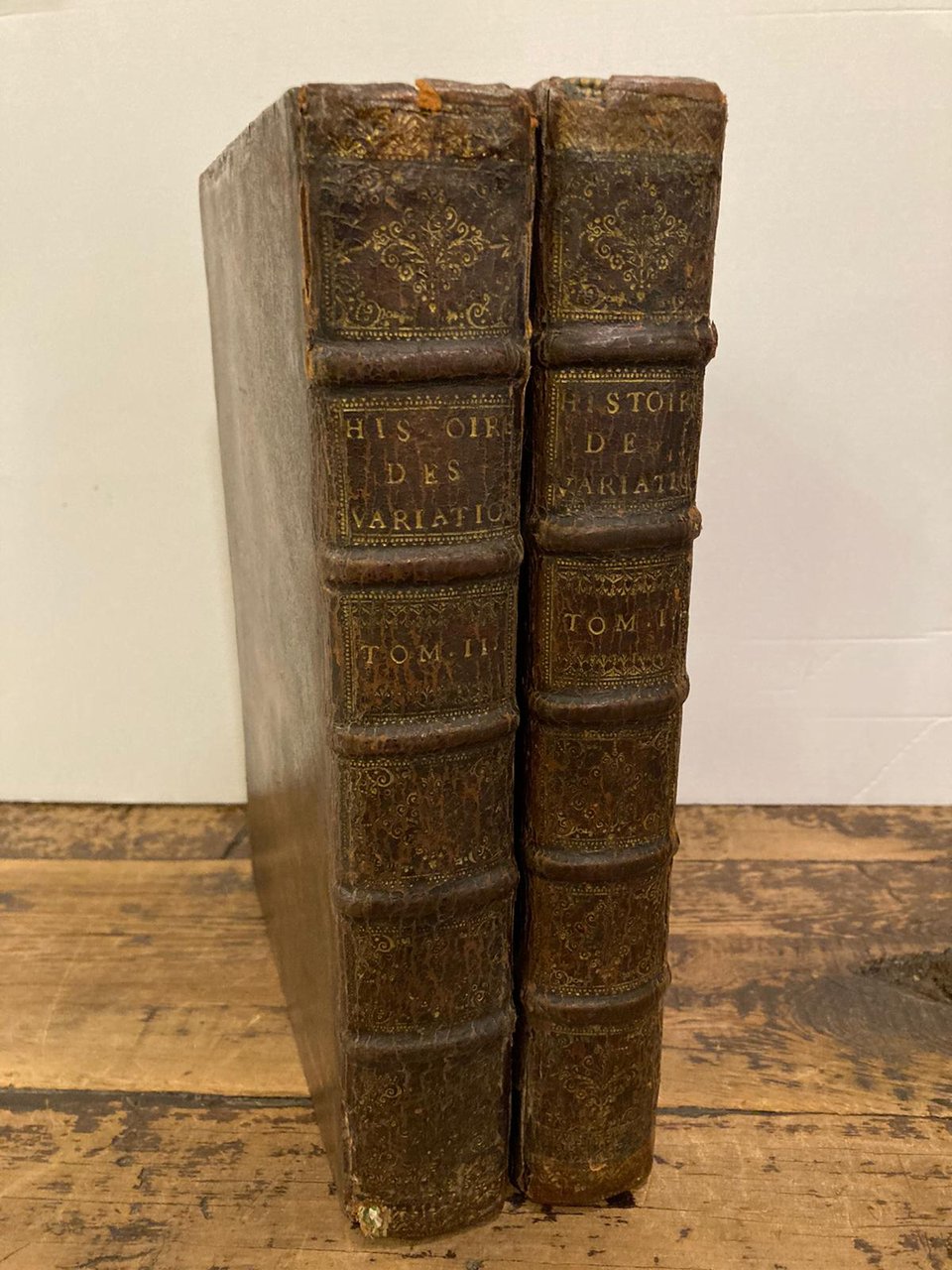 2 volumi in-4° (25,9x18,8 cm). (20) carte, 506pp., (17) carte; (4)carte, 680pp., (22) carte. Legatura coeva in piena pelle con titolo e fregi inoro su dorsi a nervi, tagli rossi a spruzzo. Prima edizione. Uno dei testipiù importanti di Bossuet contro il protestantesimo, opera del vescovo francese e precettore del Delfino (1627-1704). Boursault, p. 79 ; Tchemerzine I, 859.