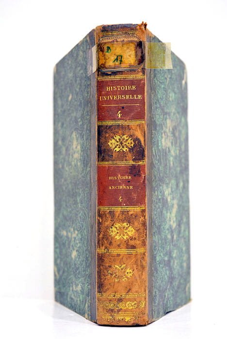 Tome 4 seul. 2 feuillets. 356 pages. Notes: 225 pages. 1 feuillet. (21x13 Cm). 3 planches dépliantes. Demi-cuir. Dos lisse orné. Plats frottés. Coiffes et coins émoussés. Étiquette de bibliothèque sur le dos. Quelques taches et rousseurs. Écritures manuscrites sur les premières pages. Tampons de bibliothèque. Ouvrage contenant l'Histoire d'Egypte, des Peuples de Canaan, des Philiftins, des anciens Syriens, des Phéniciens & partie de celle des Juifs.