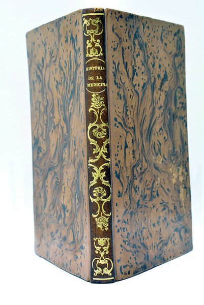 118 pages. 1 page de notes. (15x10 Cm). Plein-cuir brun. Dos lisse orné de motifs dorés. Légers accrocs en coiffe supérieure et premier plat. Édition originale de la première histoire abrégée de la Médecine publiée en Espagne. Rares rousseurs en tranches. Jolie conservation.