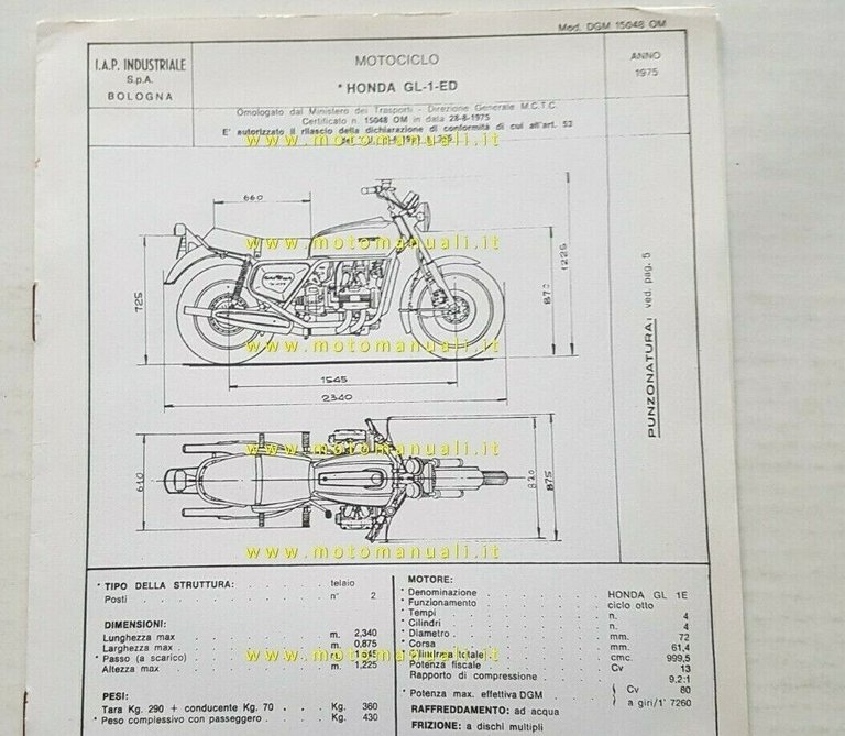Honda 1000 Gold Wing 1975 scheda omologazione DGM originale Motorizzazione