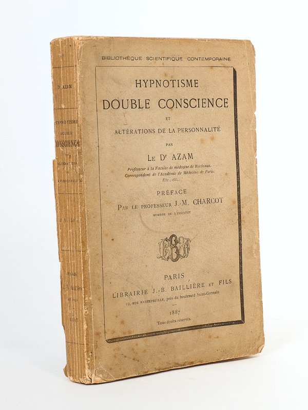 E.O., 1 vol. in-12 br., coll. Bibliothèque Scientifique Contemporaine, Librairie J.-B. Baillière et fils, Paris, 1887, 283 pp. Etat satisfaisant (couv. faible et avec accrocs, lég. rouss. d'usage, bon état par ailleurs) pour cet ouvrage écrit par un médecin bordelais, chirurgien de formation et professeur à la Faculté, qui s'intéressa à la psychologie, et en particulier aux troubles de la personnalité multiple.