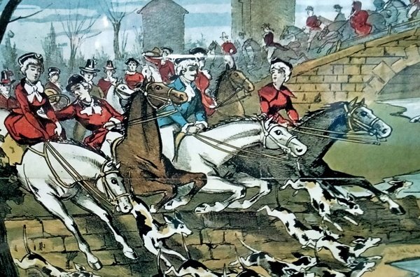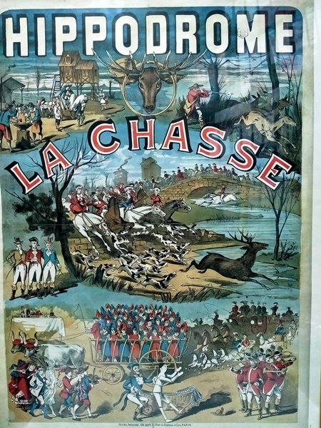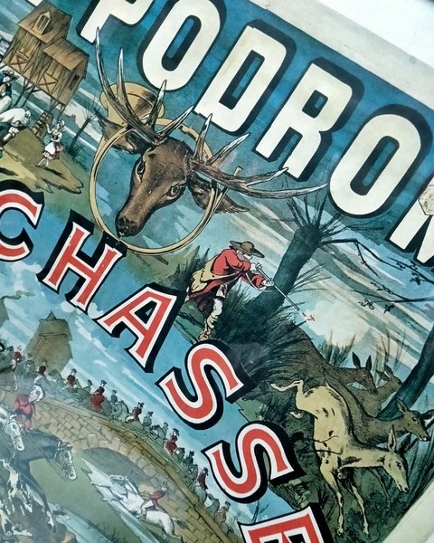 MANIFESTO 60X40 CM. RAFFIGURANTE SCENE DI CACCIA,CORNICE H 60 CM,L 50 CM,P 2 CM.(FACSIMILE DI MANIFESTO STAMPATO NEL 1885)