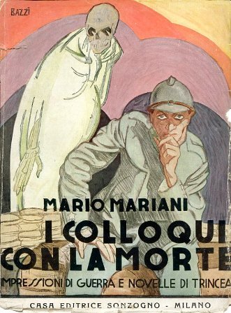 In-16°, pp. 236, brossura editoriale illustrata a colori da Bazzi con inquietante raffigurazione di un soldato alle cui spalle si erge la Morte in forma di scheletro ghignante. Una firma cassata al frontespizio. Dorso restaurato. In barbe, in discreto stato. Prima edizione. Indice: I colloqui con la morte - Mariella - Violetta - Der Kaiser - I fratelli Jascow - A piedi nudi - Svetozar Milkovich - Le campane dei morti - L'ultimo appuntamento - Contadini - Isonzo-Milano e ritorno - Il poeta del rischio - L'ultima evoluzione di Passanante Cavatappi, socialista, pacifista, neutralista. Mario Mariani (Roma, 1884in Brasile, 1951) fu poeta, fecondo romanziere che predilesse spesso i soggetti erotici, giornalista (fu corrispondente a Berlino di vari quotidiani), fondatore delle riviste Novella e Comoedia. Antifascista, all'avvento del regime emigrò in Francia, dove pubblicò i Quaderni dell'Antifascismo e i Quaderni del volontarismo, e poi in Brasile, dove rimase per il resto dei suoi giorni. Egli fu 'scrittore di vena irregolare, anarcoide, erotizzante e. contestatrice' (Dizionario generale degli autori italiani contemporanei, Firenze, Vallecchi, 1974, II, p. 783). Spaducci, p. 172.