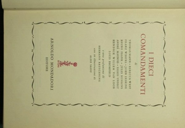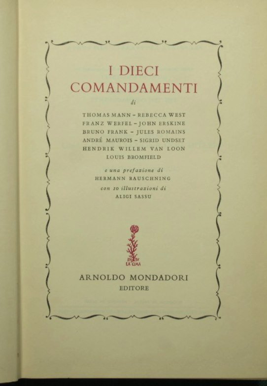 Di Thomas Mann, Rebecca West, Franz Werfel, John Erskine, Bruno Frank, Jules Romains, Andrè Maurois, Sigrid Undset, Hendrik Willem Van Loon, Luois Bromfield - Una prefazione di Hermann Rauschning - Collana Il ponte. I grandi narratori italiani e stranieri. N. 16 - in 8° - pp.433 - Tela editoriale - Tavole a colori di Aligi Sassu - Prima edizione - Nota di possesso a inchiostro all'occhiello
