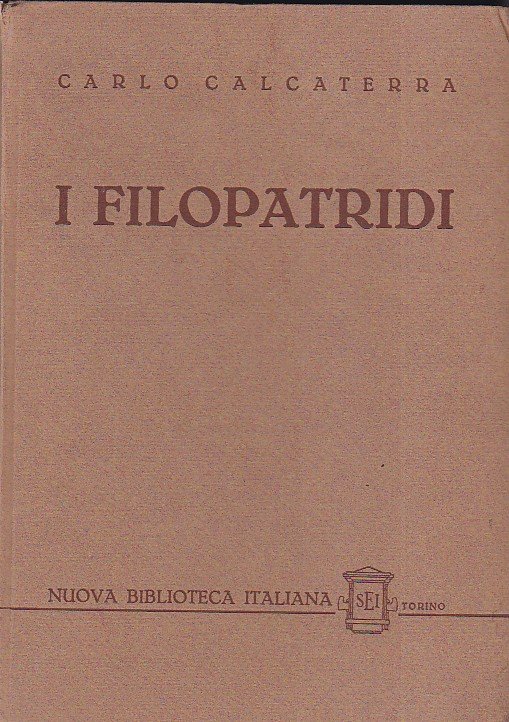 In-8°, pp. XXXVI, 512, cartonatura editoriale marroncina. Sguardie figurate. Alcune tavv. in b.n. f.t. Buon esemplare con qualche ingiallitura dovuta al tipo di carta. Unica edizione, volume secondo della collana 'Nuova Biblioteca Italiana', di questo studio sui 'Filopatridi' con antologia di brani degli autori in questione e pagine introduttive. Gli autori antologizzati sono: Papacino d'Antoni, Prospero Balbo, Camillo Maulandi, Dalmazzo Vasco, Giambattista Vasco, Carlo Tenivelli, Gaetano Giacinto Loya, Galeani Napione, Valperga Caluso, Vernazza, Marenco di Castellamonte, Felice San Martino, Franchi di Pont, Ferrero Ponziglione, Giuseppe Pavesio, Giambattista Somis, Carlo Bossi (Albo Crisso), Michele Buniva, Clemente Damiano di Priocca. Carlo Calcaterra (Premia, Novara, 1884-Santa Maria Maggiore, Novara, 1952), tra i maggiori critici e storici della letteratura del nostro Novecento, fondatore di 'Convivium' e di 'Studi petrarcheschi', curatore dell'opera omnia di Gozzano e dei 'Trionfi' petrarcheschi, direttore del 'Giornale Storico della Letteratura Italiana', fu professore di letteratura italiana negli atenei di Milano e Bologna. Nei suoi numerosi e importanti studi compenetrò il rigore del metodo storico con una viva sensibilità estetica.