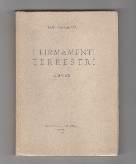 LIBROCON AUTOGRAFO.Edizione originale, si tratta della quarta opera dell’autore. Bell’esemplare, a fogli chiusi, pregiato da dedica autografa dell’autore alla prima carta: «al Poeta Ettore Cozzani omaggio devoto di Fallacara || Reggio Emilia [.] 26 sett. 29».